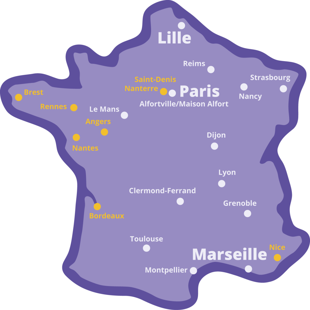 - D’ici à 2027, ouvrir de nouveaux groupes locaux dans des villes étudiantes et à forts enjeux sociaux et interculturels pour s’étendre sur tout le territoire et doubler notre impact (villes en jaune sur la carte).